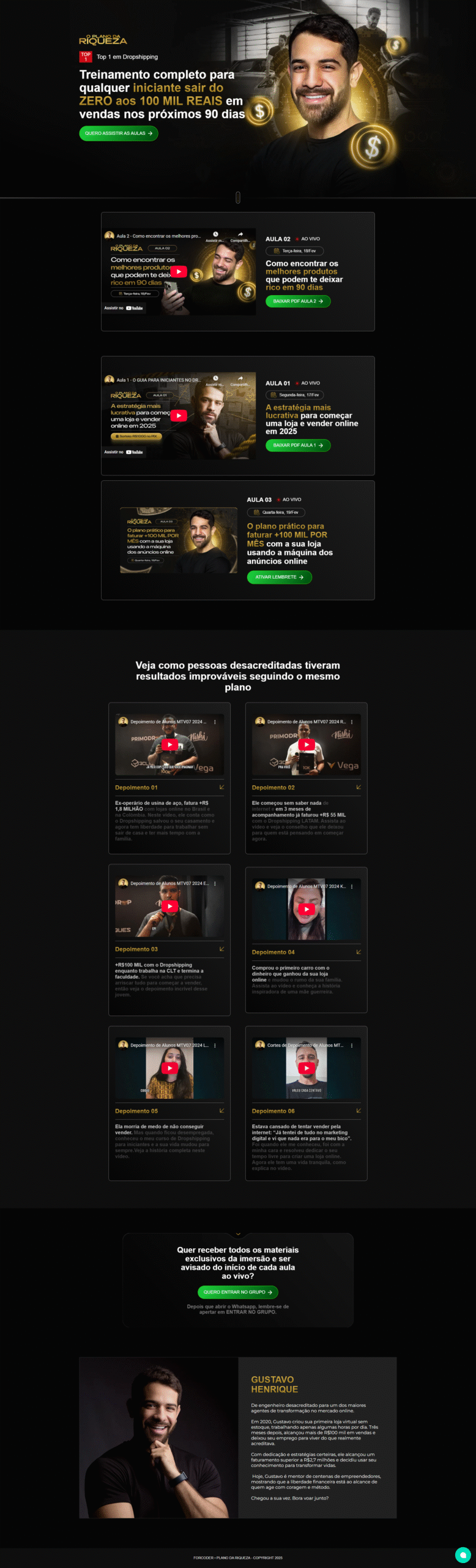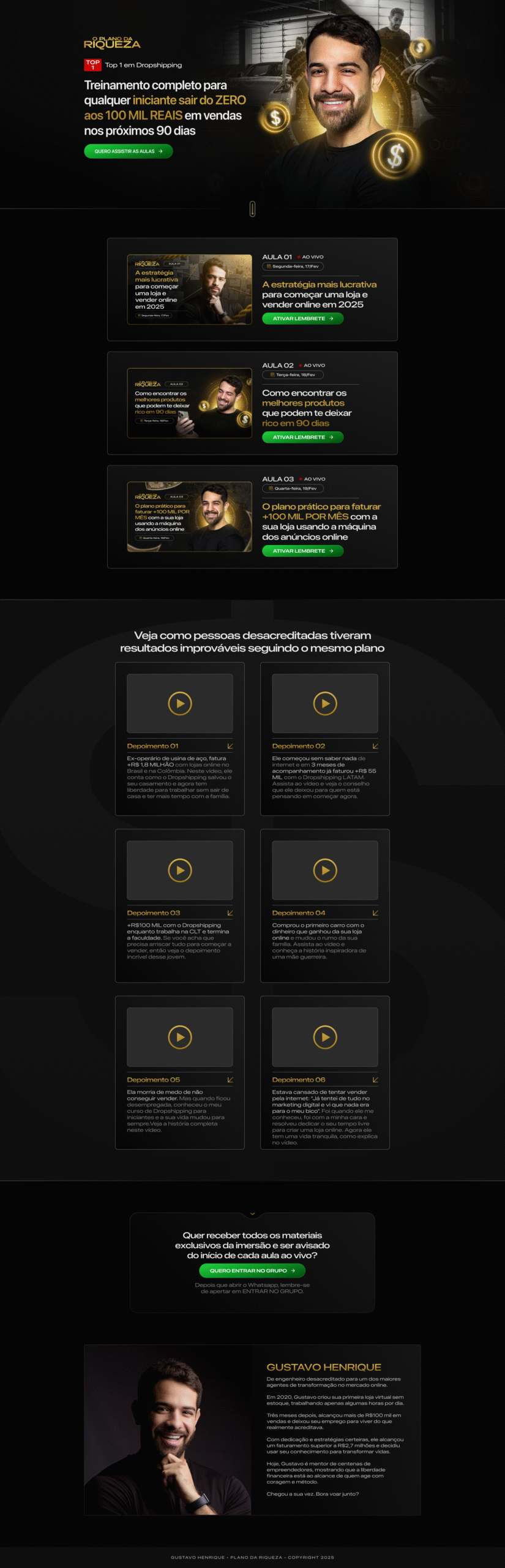 • Seções de hero, cronograma de aulas, depoimentos em vídeo, capturas de leads (grupo VIP)